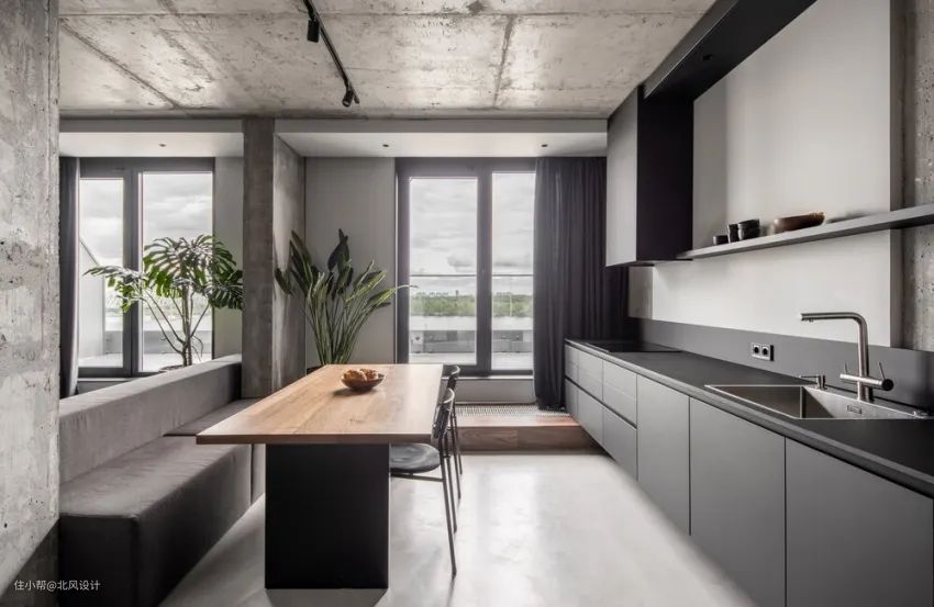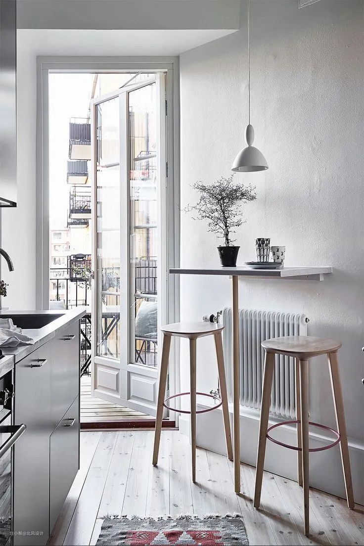 还有一种方式就是将操作台台面和窗台延伸,匀出空间给餐台,摆两把吧台椅就能一边吃饭聊天、一边欣赏窗外风景。