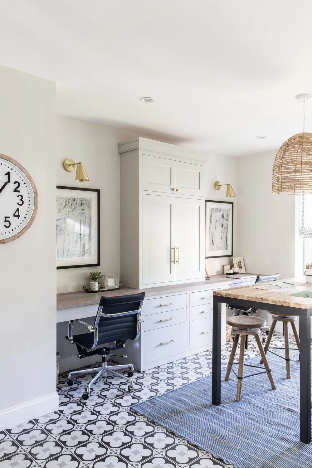 如果不需要那么多的收纳空间,还可以在两个柜子之间打造办公桌,办公椅也作为餐椅使用。