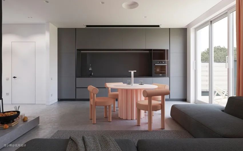 原本摆不进传统餐桌的小餐厅,现在于客厅中有了一席之地,空间的视觉效果也变得开阔、明朗。