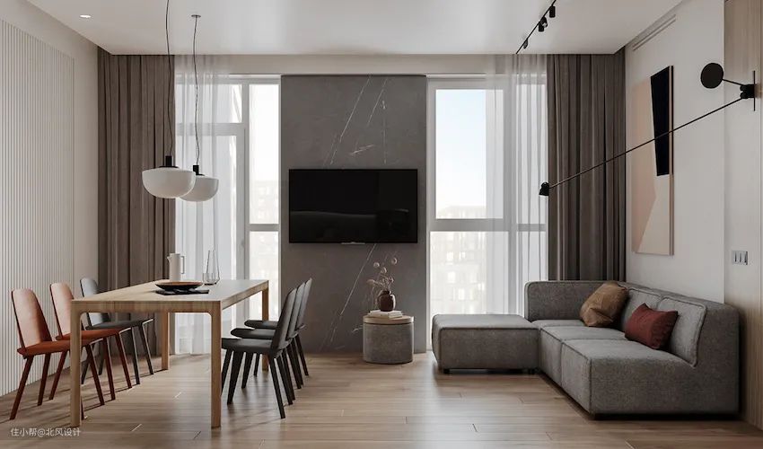 在餐厅与客厅之间用部分墙面做隔断,既可以让电视有挂置的地方,还能让两个空间减少对彼此的干扰。