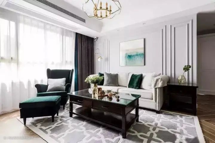 客厅对称的石膏线背景墙美式风十足,丝绒墨绿色的沙发充满复古轻奢感,再加上意境十足的装饰画,将整个混搭风氛围营造的无比浓厚。