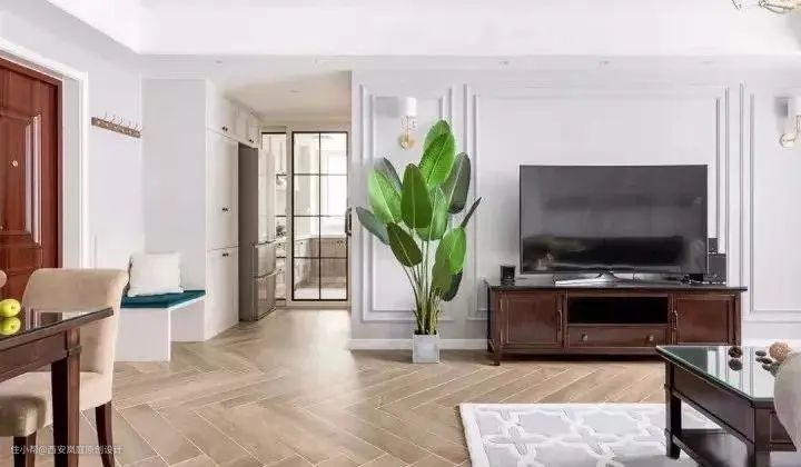 客厅使用人字形地板铺贴,在视觉上有拉伸空间的效果。厨房使用玻璃拉门,将阳光引入,整体通透明亮。