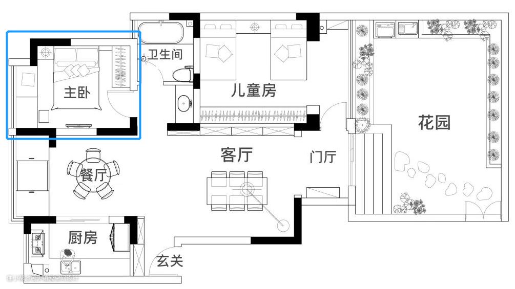现代应用:卧室的布局讲究规整实用,根据房间的开门、进深和门窗位置综合考虑。