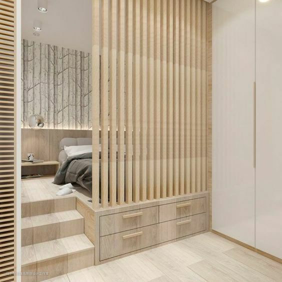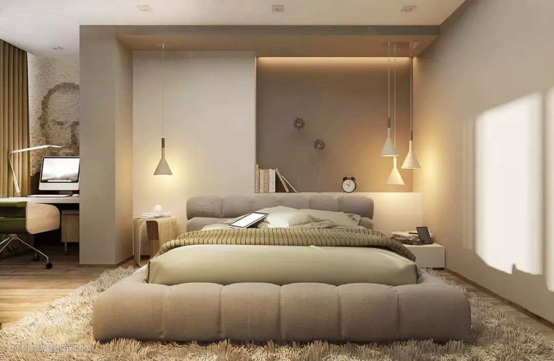 地台不一定是木质的,也可以选择软体垫充当地台,让睡眠区看起来更舒适,床尾凳都可以融入其中了,光看看就舒服极了。