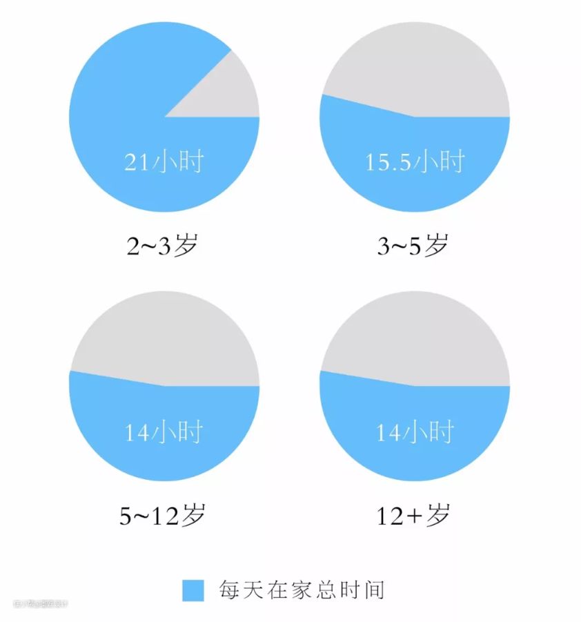先来看一下儿童的婴儿期、幼儿期和青少年期每天在家的总时间分布图。
