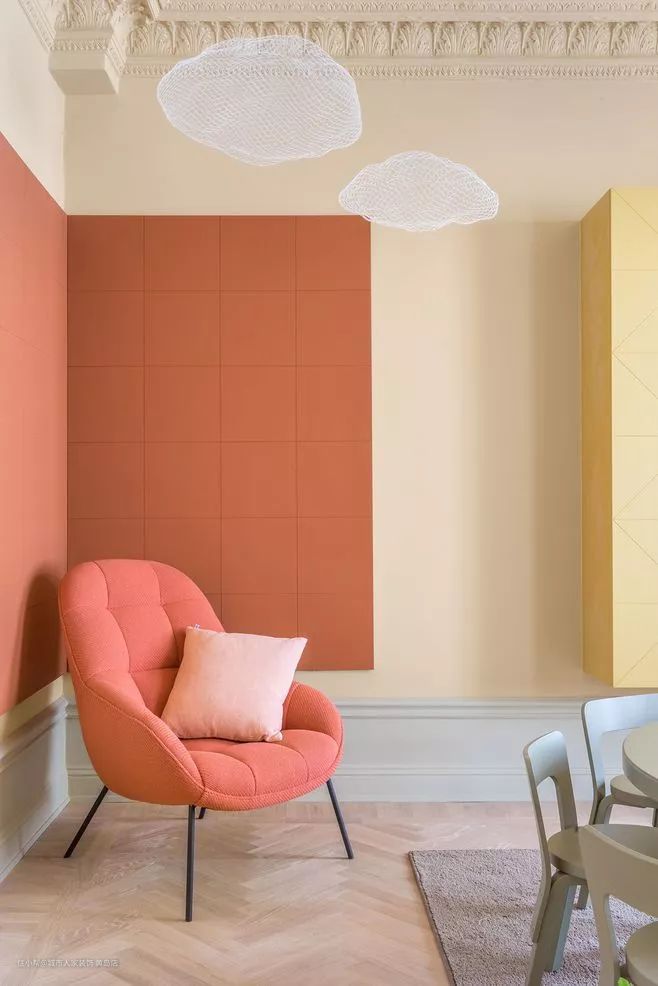 ▎将蜜瓜橙装饰在家中的墙面上, 不论是大面积的使用,还是作为配色,都能够让我们感受到甜蜜与温馨。