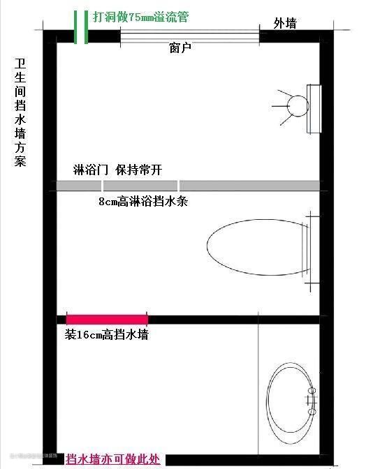 主要是针对小概率返水的风险。已经装修好的房屋基本没有预留溢流管的可能性,除非把地面敲了重新搞,不妨采用挡水墙和溢流管结合使用的方法。挡水墙的作用是,在马桶或者地漏发生返水时及时挡住污水,使其通过溢流管排至室外。