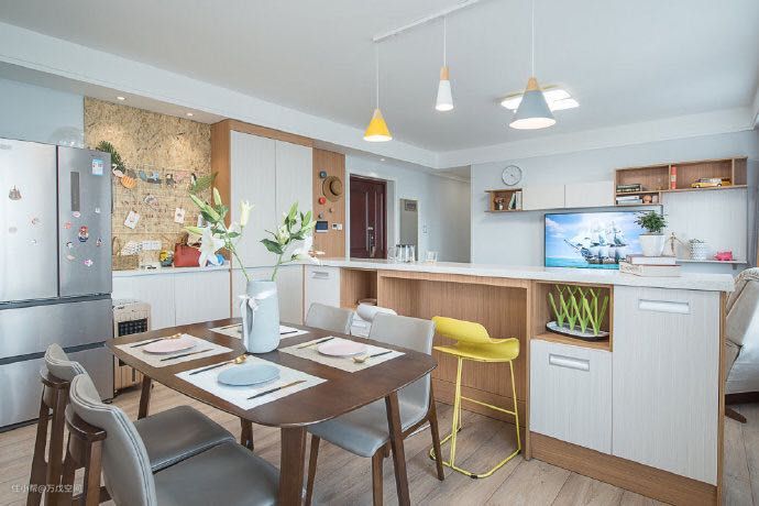 为了避免上述情况发生,在装修之前,我们做了一个最最最重要的决定:在餐桌旁设置个水吧台,用来收纳大桌子上可能会产生的一切杂物。入住半年多了,想问下大桌子现在还好吗?哈哈,有图为证: