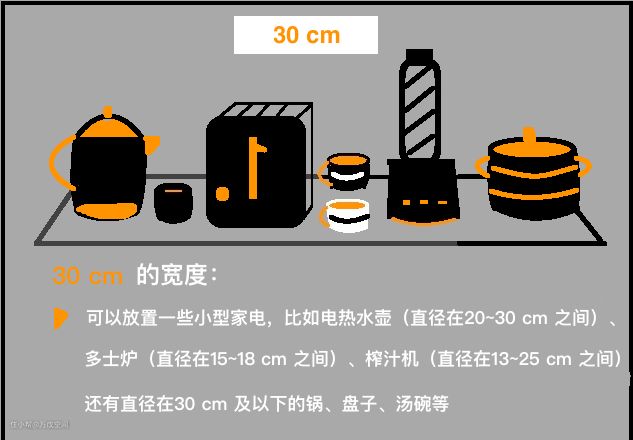餐边柜的长度,每家情况可能都不一样,但深度相对来说就那么几个选择。在决定餐边柜的深度前,要想好你在台面上打算放什么东西(同理隔板)。如果打算放烧水壶、多士炉等小家电,只需要30 cm 的深度就够了,但如果打算放电饭煲、烤箱这些中型电器,那么台面的进深至少要在40 cm 及以上。关于台面(隔板)什么宽度下能放下什么东西,画了几幅图供大家参考: