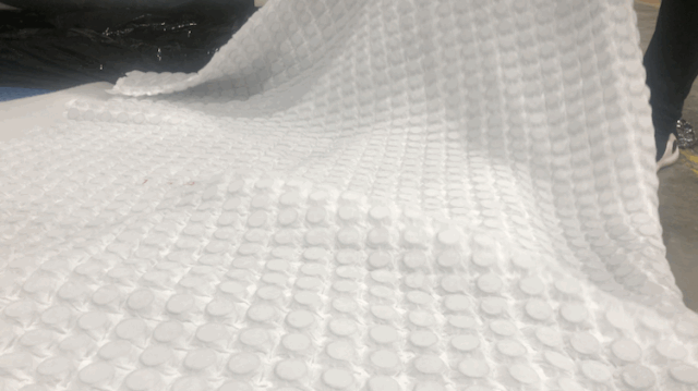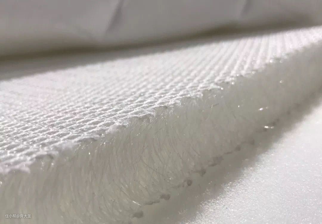 由双面网和中间连接丝组成,双面网布决定了传统材料无可比拟的透气性,中间连接丝为0.18mm粗的涤纶单丝,保证了3D网布的回弹性。用8-10层的3D材料叠加至厚度16cm,然后外套用三明治网布和3D材料绗缝加拉链。其实这种材料和我们办公椅的网面材料是一样的,睡感较硬,透气性良好,可以直接水洗。