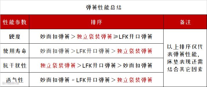 主流弹簧有三种,妙而扣弹簧、LFK开口弹簧和独立袋弹簧。