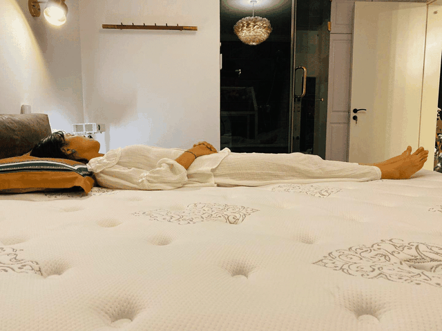 可以看到躺在床垫上,云托层会很好的给人一种包裹感,虽然人“陷”在床垫中,但其实臀部和腰部的支撑足够,保证了脊椎的健康状态。