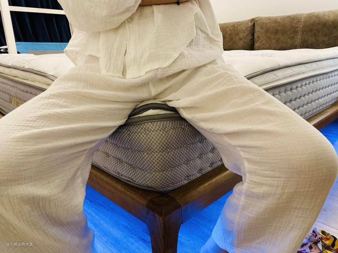 「悦享」床垫的边缘支撑做的很好,可以看到在边缘坐下时,身子是直的。如果是支撑不够的床垫,身子在放松状态下会不自觉前倾。