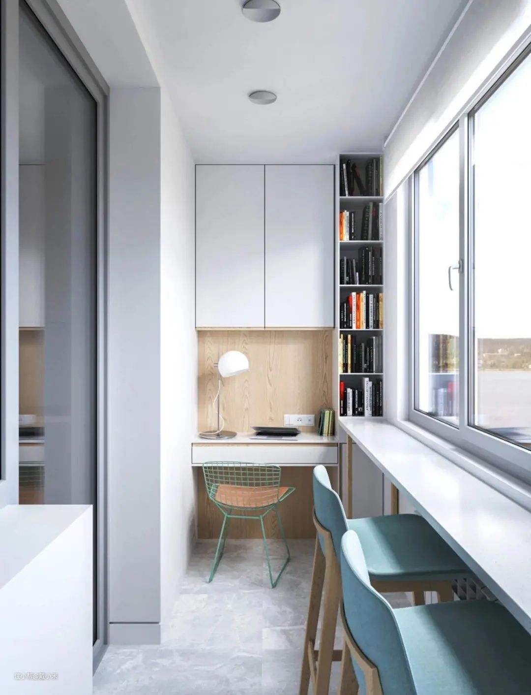 4,小户型的阳台空间可要好好利用,这个业主家的阳台就是一个小书房,紧挨窗台设计定制书桌,两侧挂壁式储物柜,实用性满分。