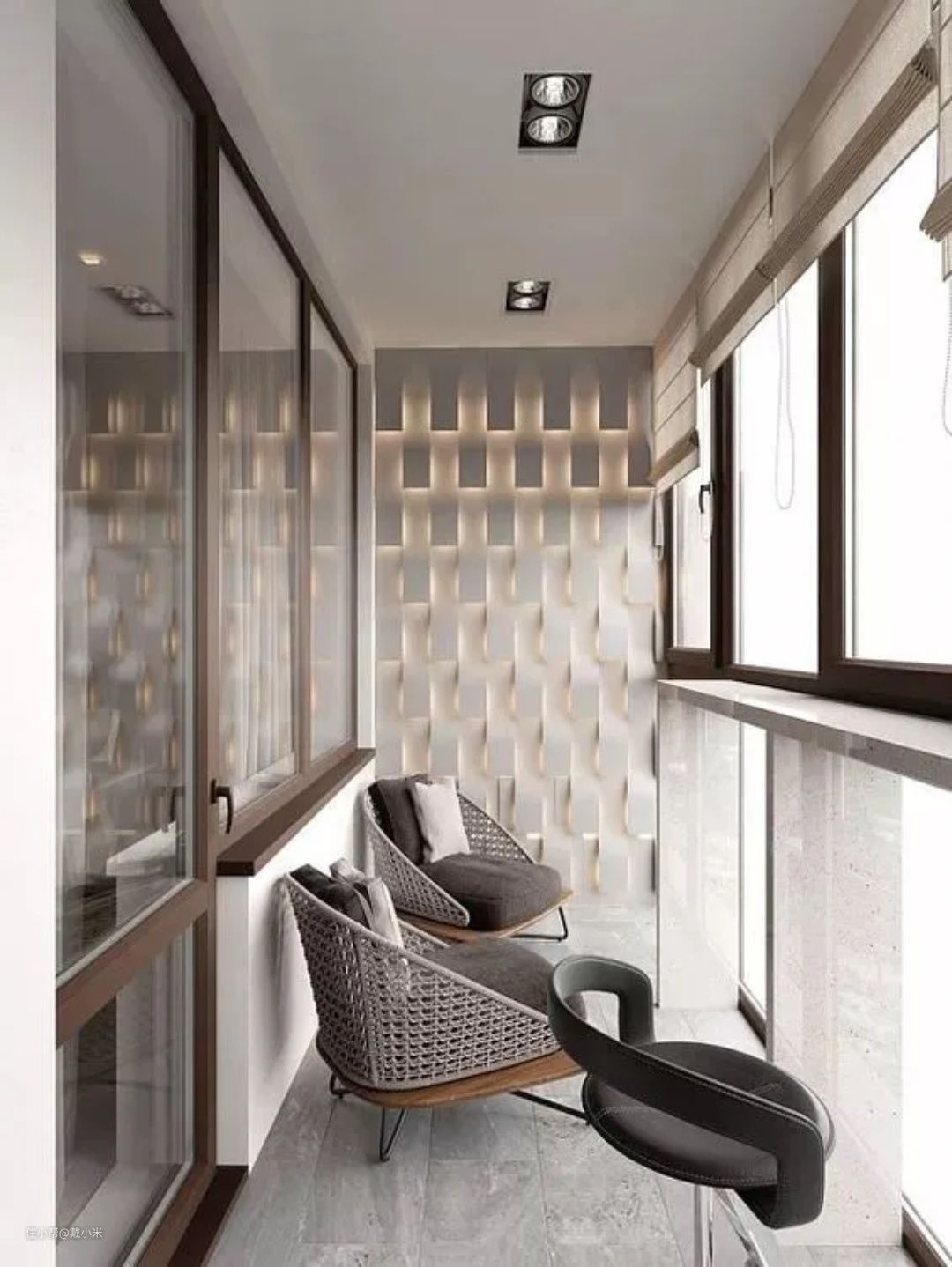 1,大户型大胆设计封闭式阳台,做一个大大的落地窗,尽可能采光,视野通透。怕窗帘影响氛围,装百叶窗,保留隐私。阳台不再像传统的家里那样,堆满杂物或者用来晒衣服。而是变身为多功能区域,书房、茶室等设计在阳台,颇有风韵。