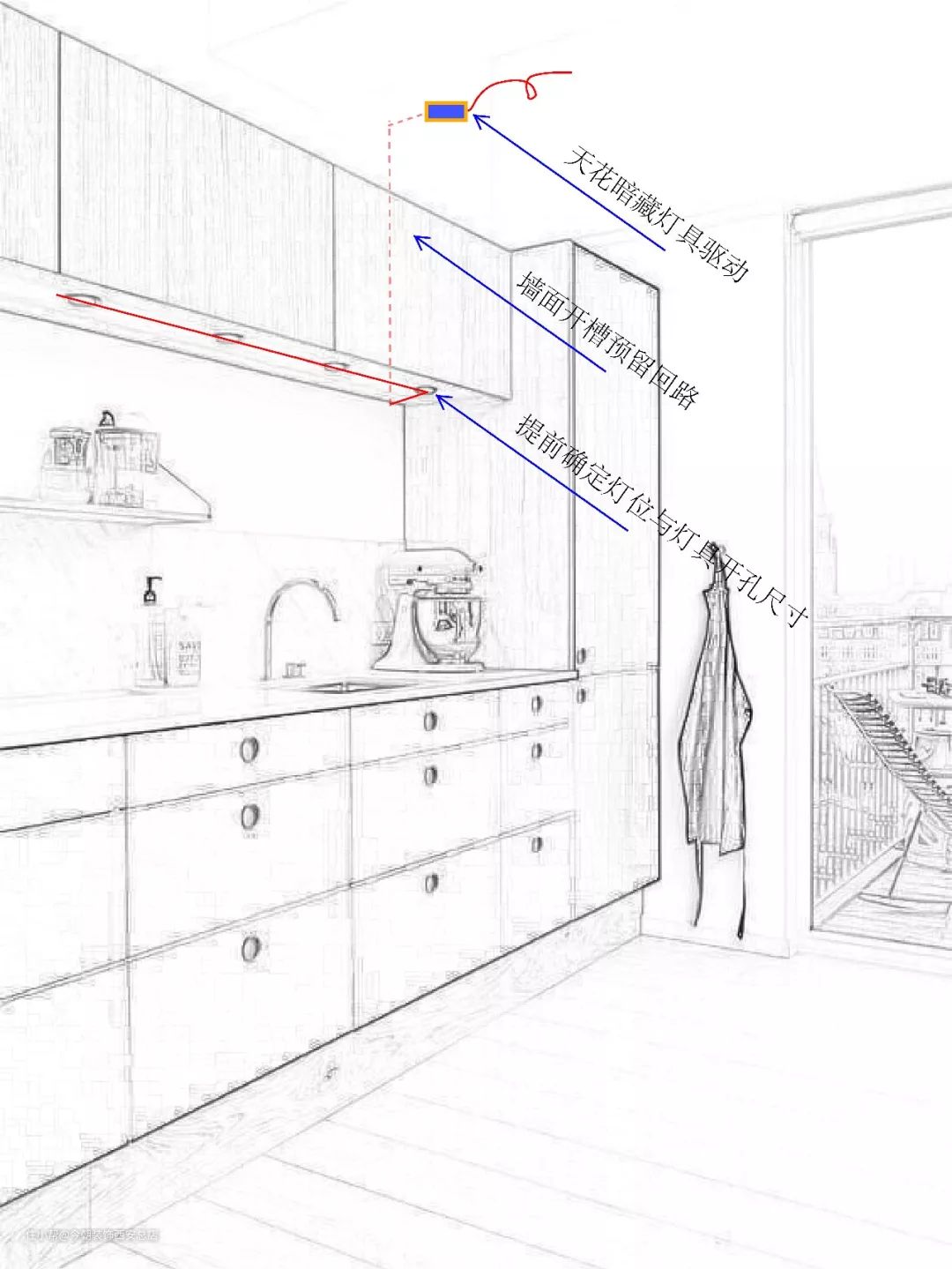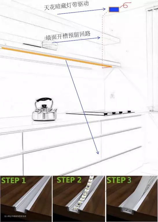① 天花预留驱动安置空间,墙面开槽预留电源回路