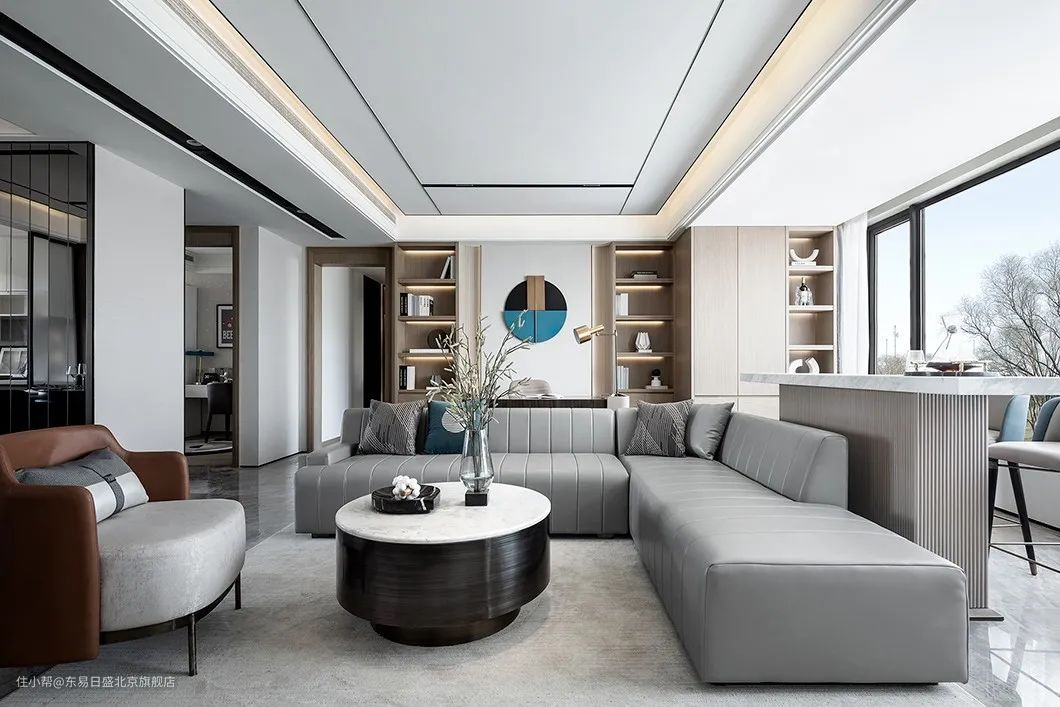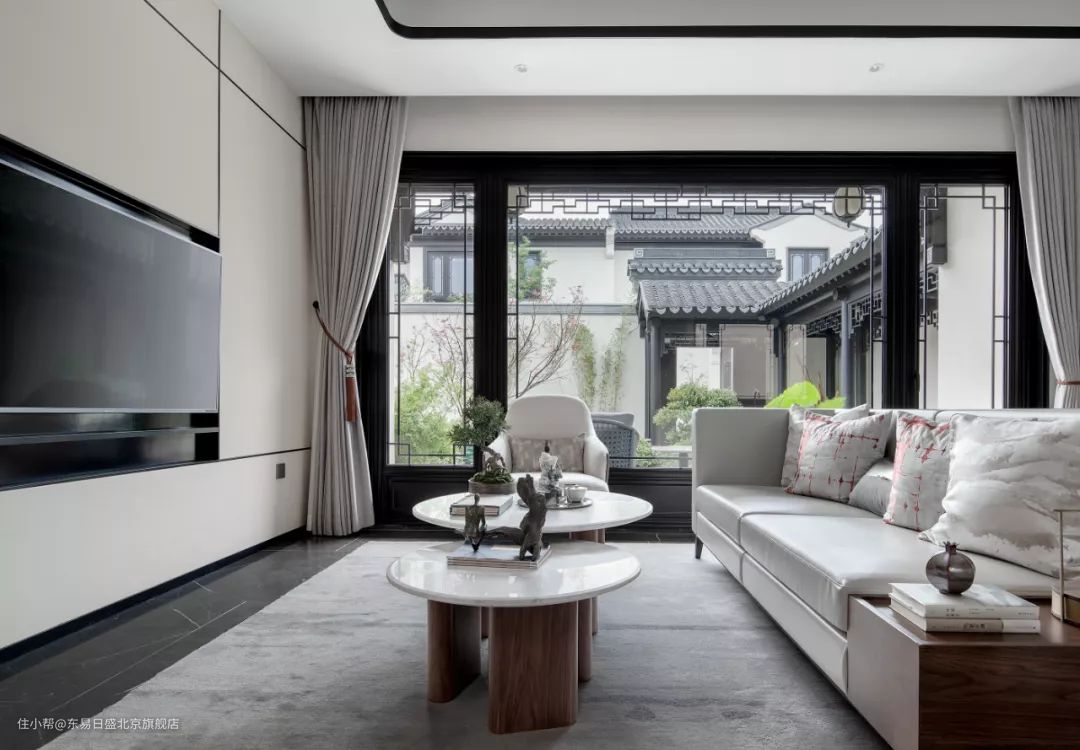 ②沙发的颜色,如果不知道怎么选,灰色、白色、米色,都很适合新中式。