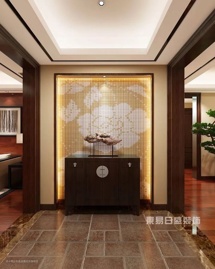 新中式风格讲究空间层次感,在进门之处不宜一目了然,一般采用木质隔断或者屏风作为隔断,如是室外空间,则使用假山石墙来隔绝视线。