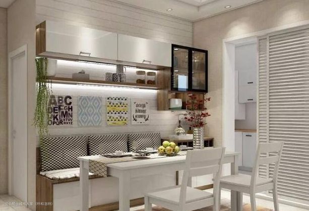 3.卡座餐边柜一体,省下两张餐椅 小户型可以让餐边柜做成卡座。正面坐卧,背面收纳,一柜多用!