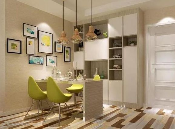 三.这样的餐边柜 一点都不占地儿不仅分担餐桌和厨房的压力,餐边柜还能随时变入户柜、隔断柜,面积小的空间,直接把餐桌椅嵌入到餐边柜,能节省不少空间。客厅效果图