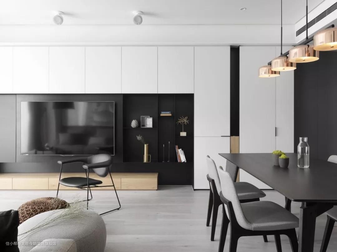 远处看上去只是一面普通的墙面,实际上是满满一墙面的储物空间,同时还可以用移门遮盖电视,打造一个没有电视的客厅。