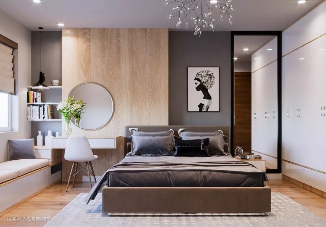 要是家里户型小,需要卧室兼具其他功能的话,咱们可以考虑在床头做个小书桌或梳妆台,这样不仅能一物多用,还能避免镜子对床,这种方式还是非常常见的。