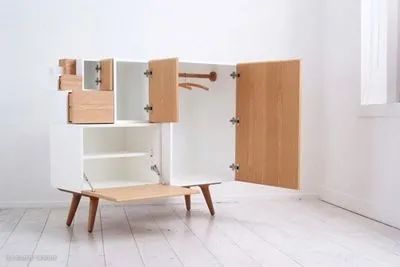 一个衣柜、一个书架、一个储物柜和一个茶几