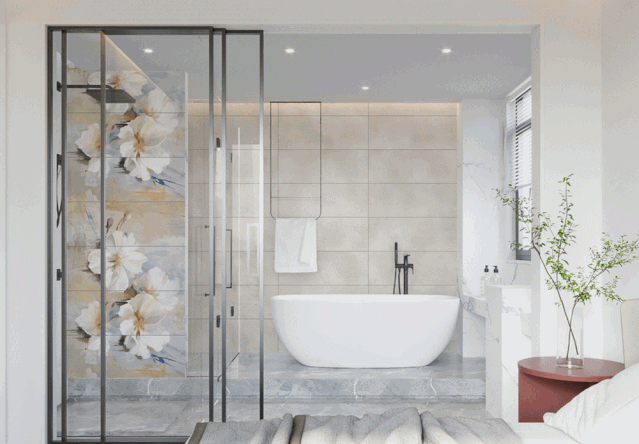 晨光穿过卧室,照亮卫生间,“塞纳晨光”打造的卫生间,炫光釉面在光照下柔润细腻,碎片纹理若隐若现,带来另一种艺术美感,白色樱花花瓣舒张开放,美轮美奂。