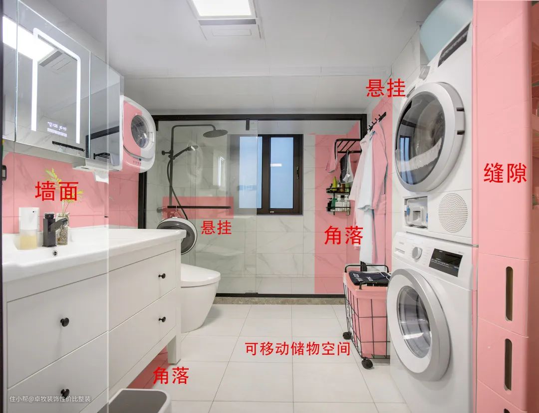 除去最基础的淋浴区、浴室柜和马桶三部分,还有一些不容易被注意到的可储物空间。