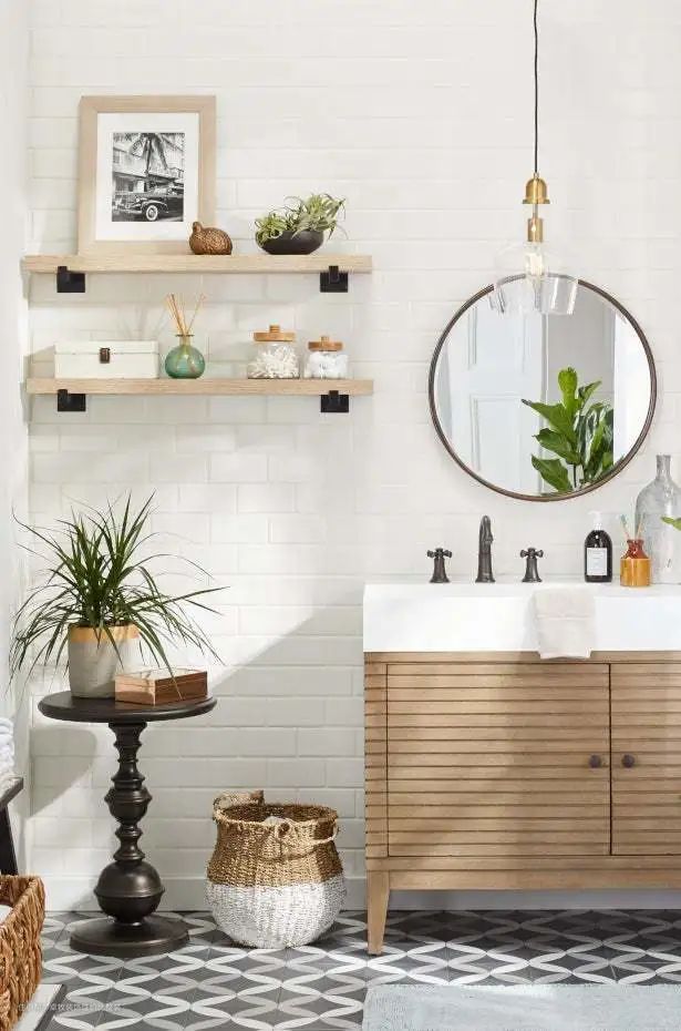 如果家里安装的是镜子或者封闭式镜柜,可以在下面加一条置物架,瞬间解决洗漱用品不易拿取的问题。