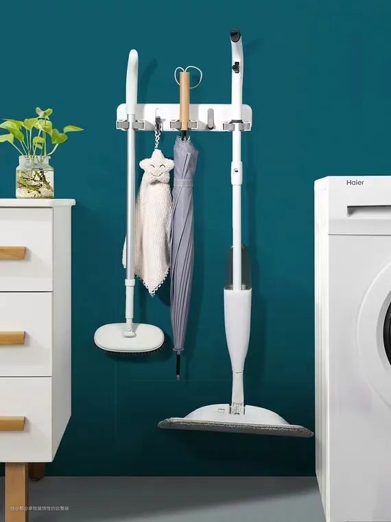 清洁工具也可以统一上墙,方便沥水和清洁,卫生间门背后就是一个不错的地方。