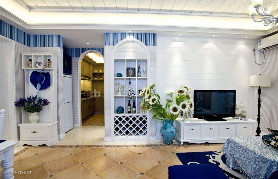▲ 很多地中海风格的客厅在细节处都颇为用心,背景墙的中间部分是颇有质感的文化墙,白色砖墙面很是别致,而顶部的蓝色线条装饰更是加分不少。