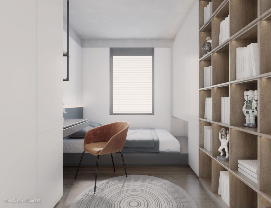 考虑到两个孩子的年龄和身高,10岁哥哥的卧室面积比妹妹的稍微大一点。房间整体选用咖啡色和白色两个主色调,利用一侧墙体做了衣柜、书桌、书架墙,满足孩子的日常生活使用功能。