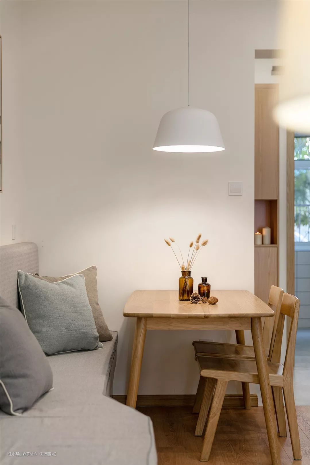 餐厅采用和客厅沙发一体式的卡座,满足了小户型在使用功能上的缺憾,也能达到小空间中视觉延伸的效果。