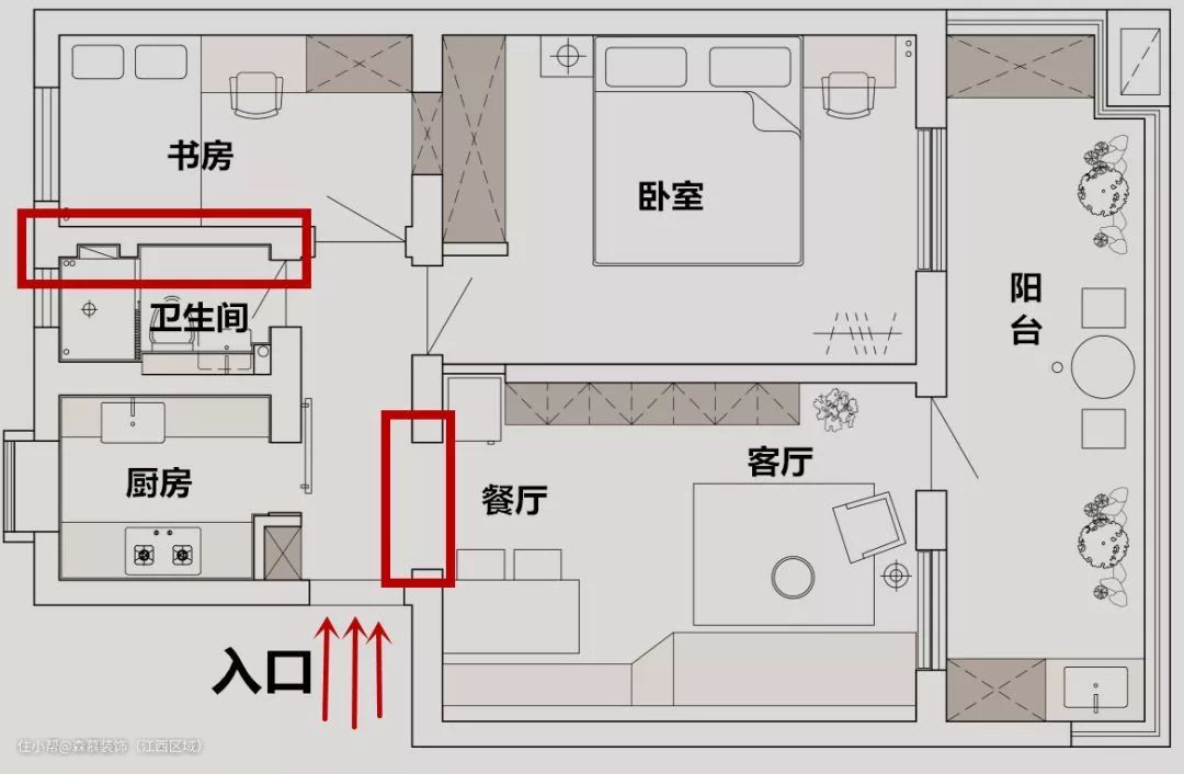 拆除了原始的门,新砌30公分墙体,门洞往借用餐厅的30公分空间,做一排格子柜,满足日常收纳。