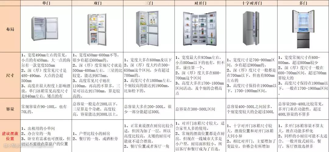 好了,简单介绍完每种冰箱的尺寸,选择和摆放,下面来做个总结。