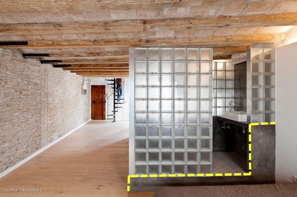 卫生间不砌红砖墙,浇10公分水泥底座,玻璃砖砌到顶透亮的!