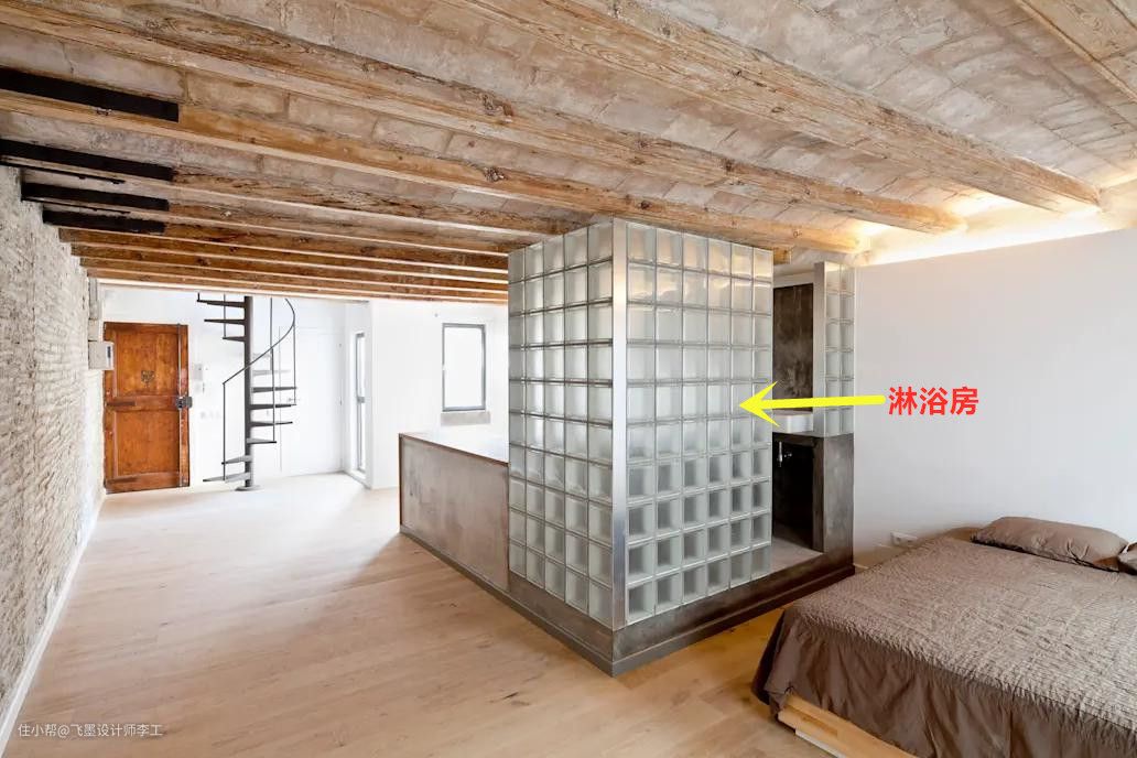 因为淋浴房位置在厨房和卧室之间,没有窗户,属于“暗淋浴房",借助玻璃砖的透光性和淋浴房预留的正对着卧室落地窗的门洞,实现采光和通风,白天不用开灯来照明,省电不憋闷。