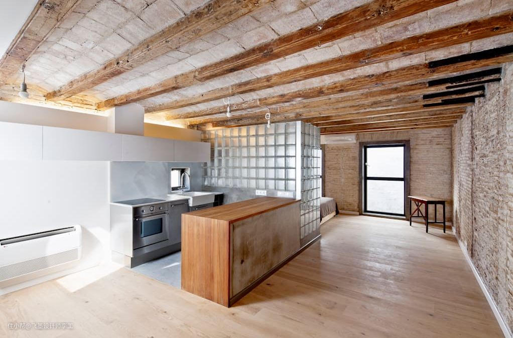 玻璃砖相比普通砖块,形状和样式上都很新颖,时尚又实用的一种材料,在厨房和卧室之间,起到隔断作用,不会阻挡卧室窗光线的进入和空气的流通,整个一层空间居住环境适宜。