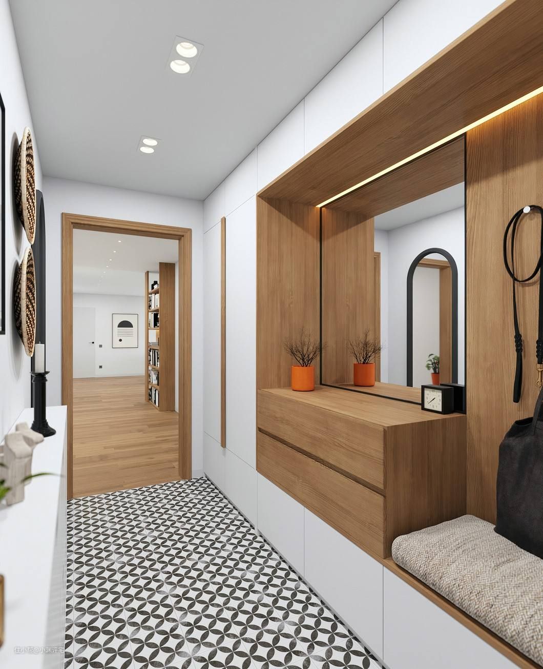 台面下方一个,距离地面300mm,用于烘鞋机等设备的供电。有些玄关柜的底部是悬空的,插座可以直接放在悬空部分。有一些玄关柜没有做悬空,这个插座就可以放在鞋柜里。