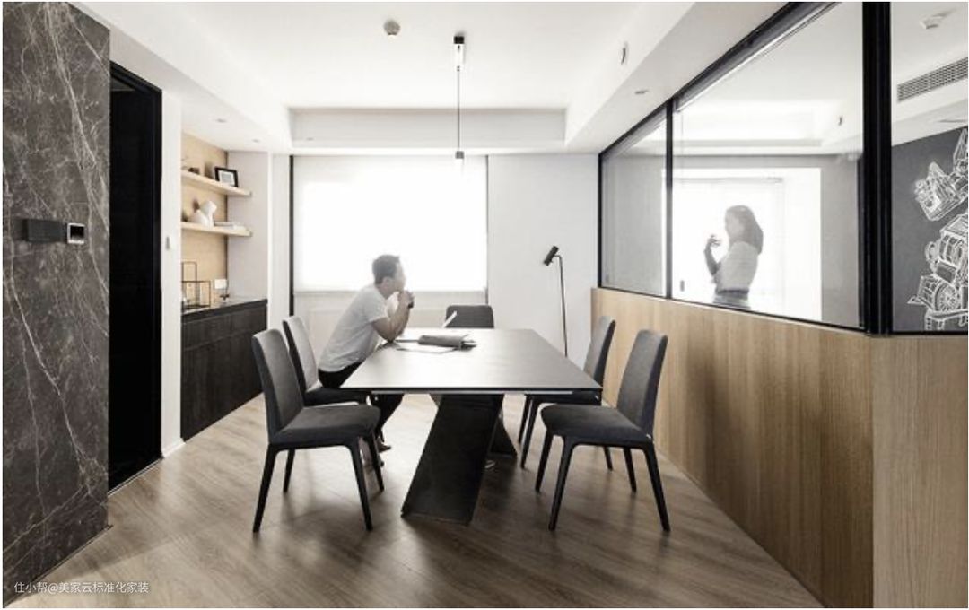 岩板台面餐桌看起来比较轻盈,因为岩板厚度一般都比较薄,比如常见的岩板有3-12mm厚,相对其它材质来说非常薄,比较适合极简风格装修,岩板优势是不渗色、防刮花、耐高温,缺点就是价格有点贵。