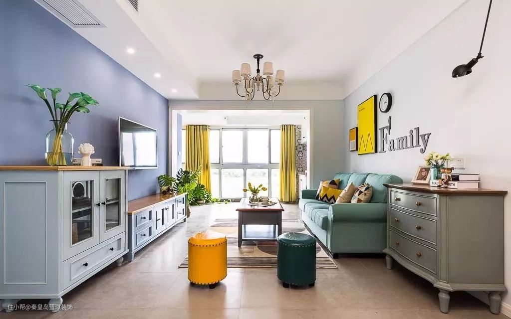 客厅的的电视背景墙是刷成了深蓝色,青绿色的布艺沙发和亮黄色的窗帘、美式风的茶几、电视柜结合起来,构造出一个艳丽而又清新的客厅空间。