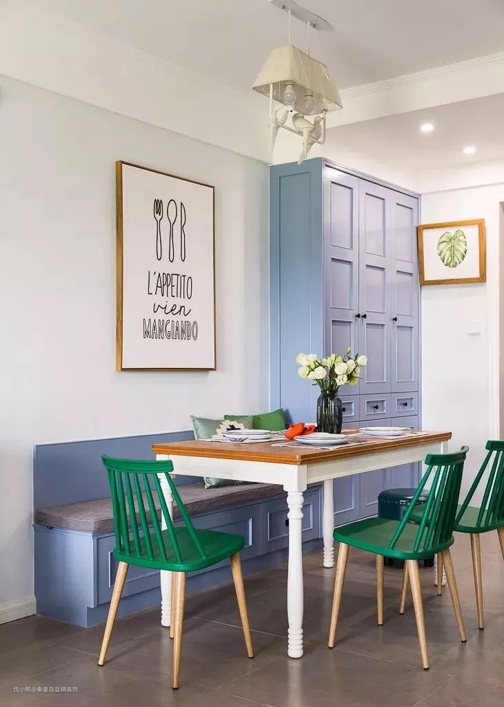 入户玄关走廊和餐厅连在了一起,卡座式的餐桌椅和鞋柜结合在一起,蓝灰色的柜子和卡座搭配美式风的餐桌,看起来典雅大方。