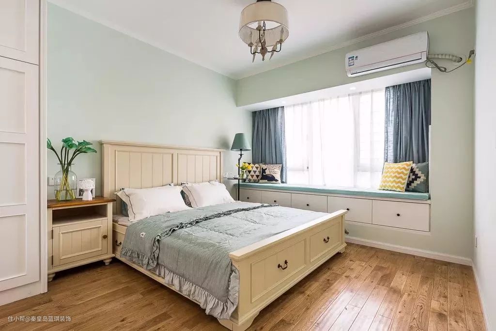 主卧室的墙面是刷成了清新的浅绿色,床品也选择了相近的颜色,靠窗的这个长飘窗柜让卧室收纳能力得以提升,坐垫和窗帘的搭配也非常好看。