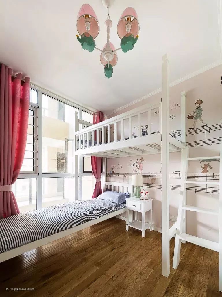 还有一间卧室是做了高低床的设计,两张床不管是给孩子还是大人陪伴用都方便,墙面趣味的装饰和粉色的窗帘相互呼应,带来了浪漫可爱的感觉。