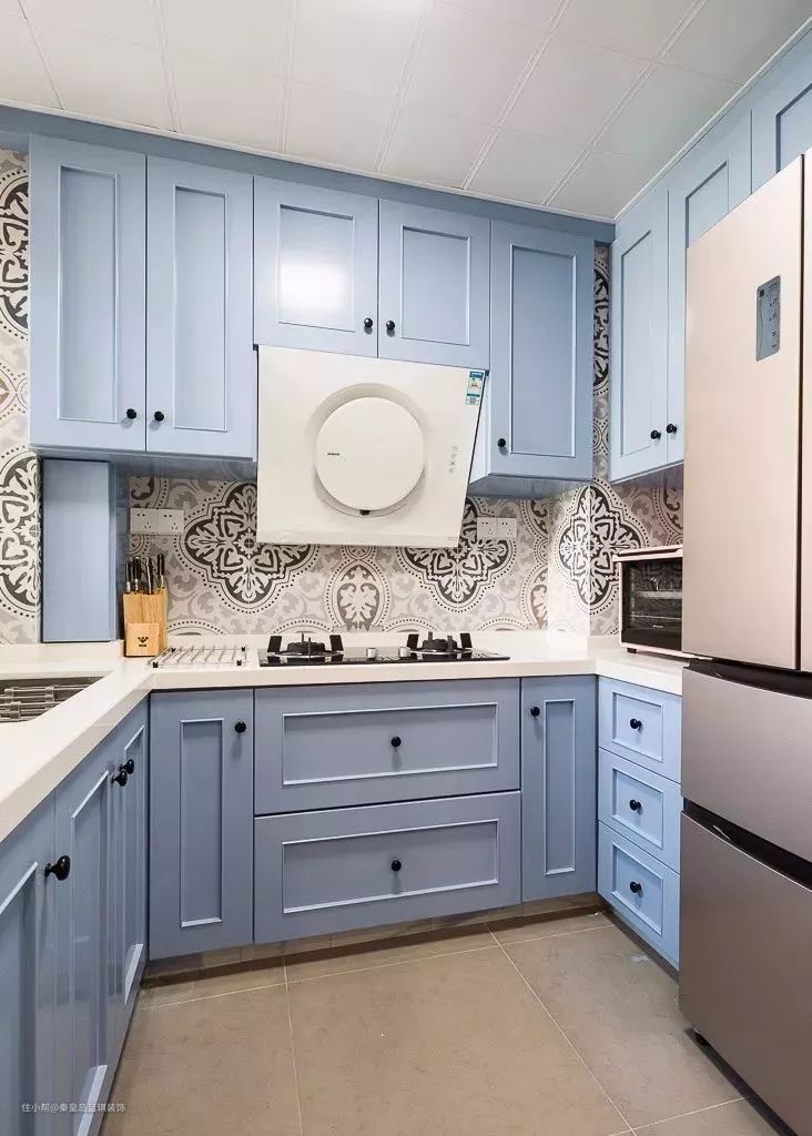 厨房内部的空间充足,做了U字形的橱柜布局方案,冰箱也放在了厨房内,拿-洗-切-炒的动线都非常短,墙面的花砖给这个厨房增添了一些文艺范。