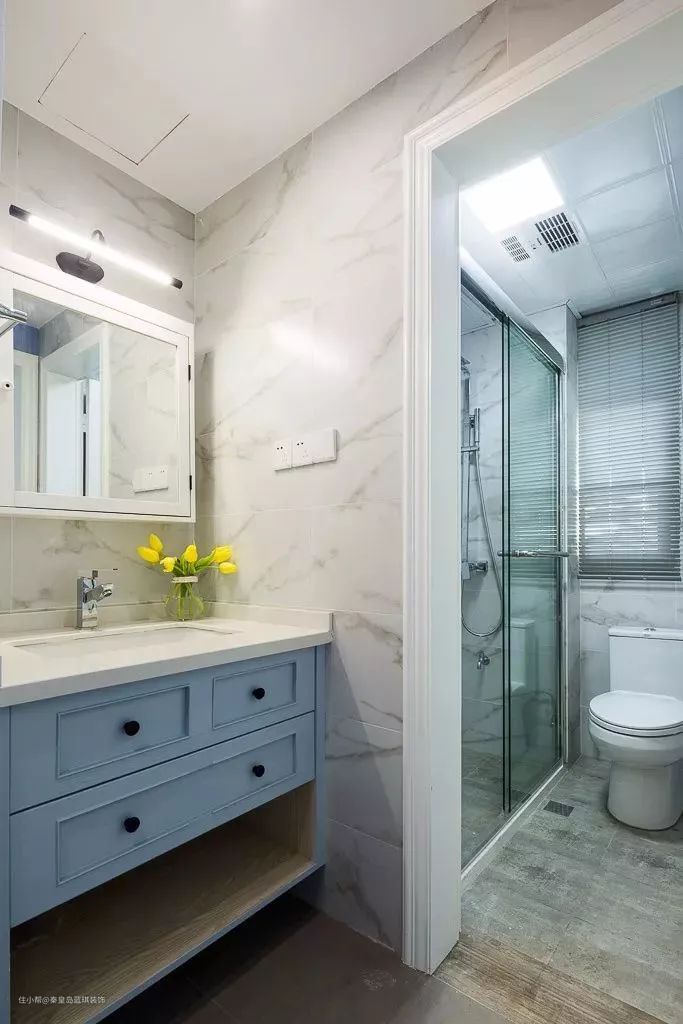 卫生间是做了干湿分离的设计,把洗手台给放在了卫生间的门外。卫生间内也用淋浴房来做干湿分离,这样再也不担心卫生间会太湿、留卫生死角了。