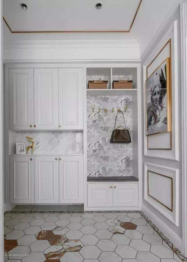 鞋柜的中部一定要预留一个台面,也或者叫斗柜,真的太好用了。我家的大钥匙、门禁卡、车钥匙之类的,都放这里,开完门随手就放,出门的时候随手就拿,很方便。有一个中空斗柜,还不会显的鞋柜过于单调。