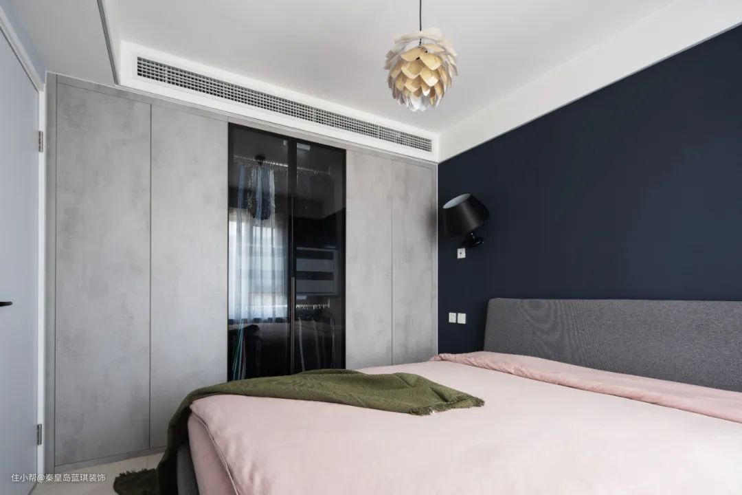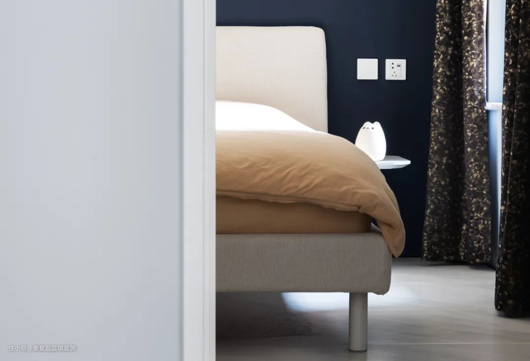 因为次卧采光会稍差一些,所以床头是选了浅色系的米色,让整体深浅有序。左侧还是做了满墙衣柜,储物空间充足。