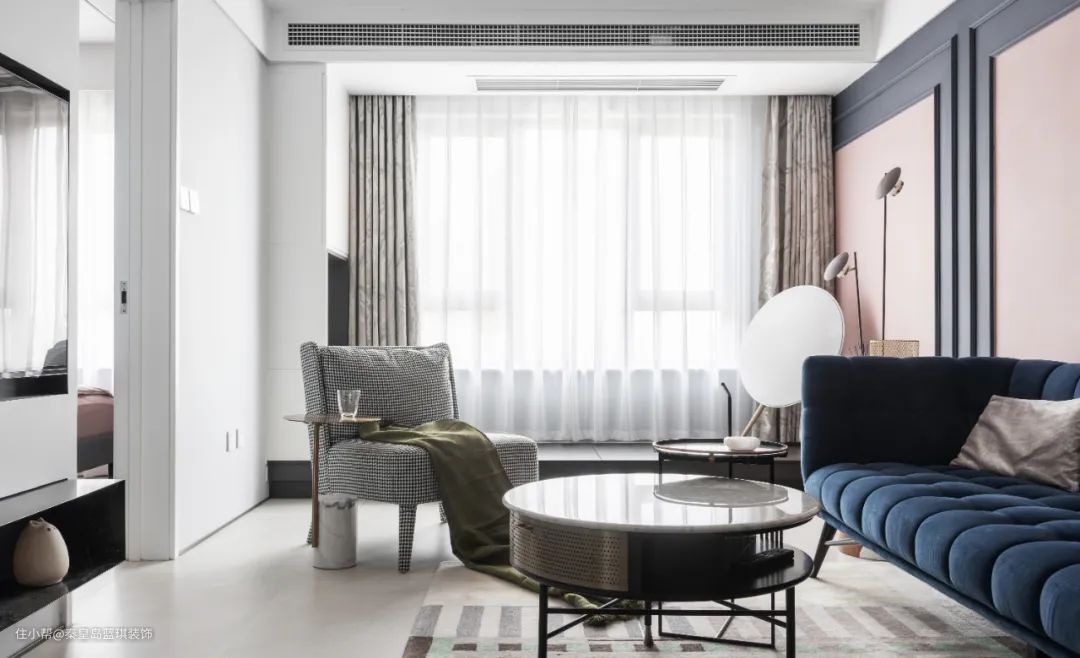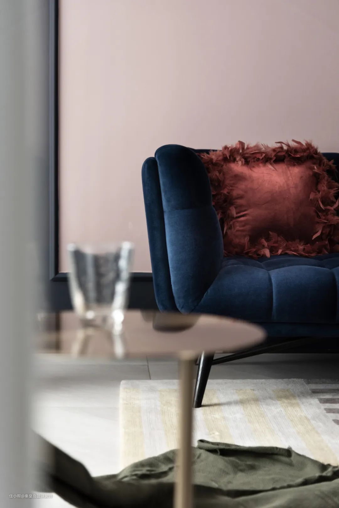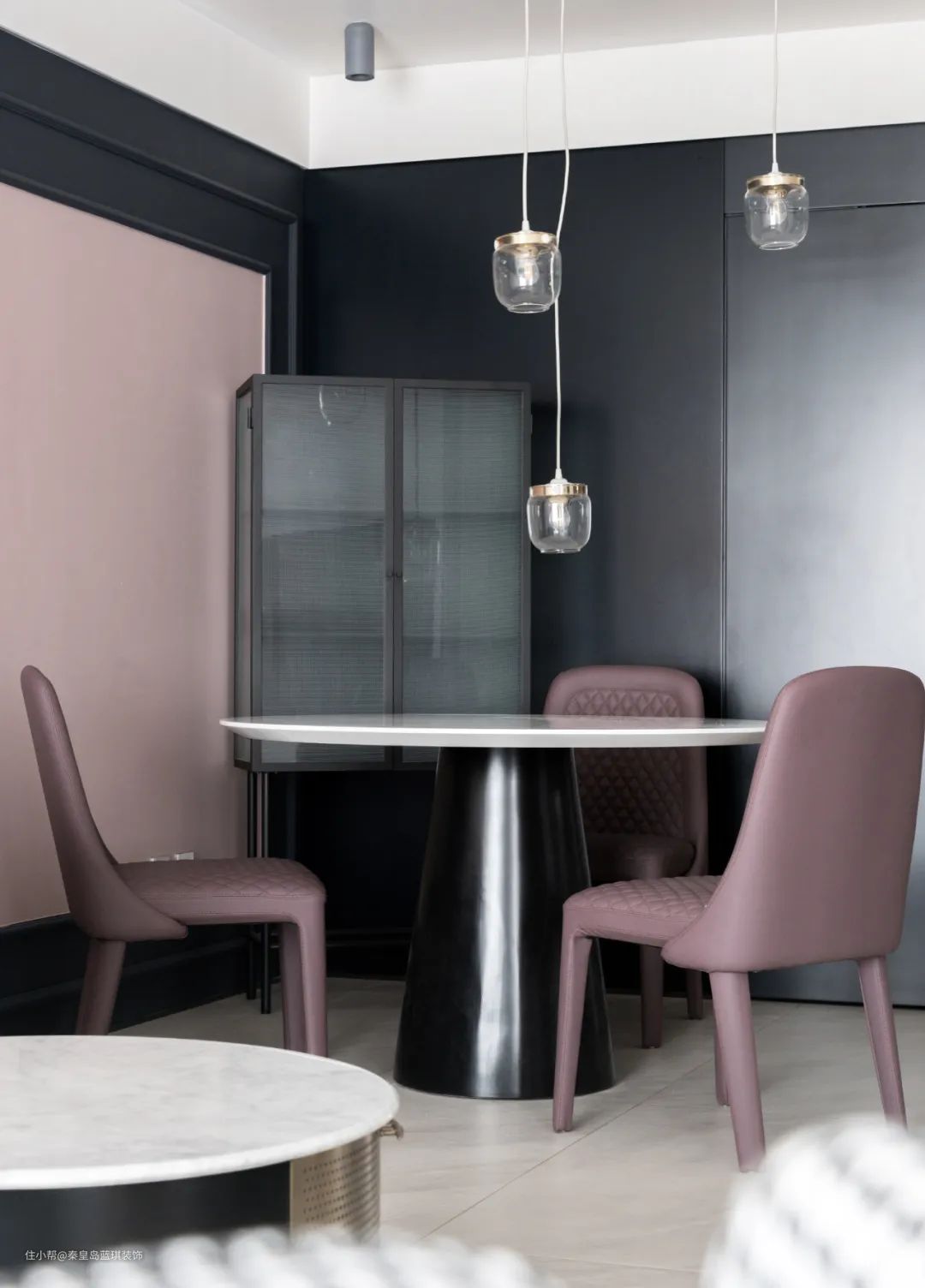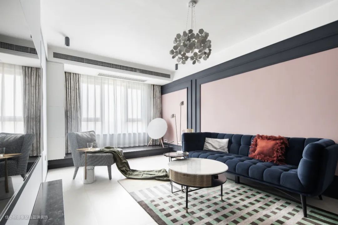 因为原来卫生间的门改了朝向,为了弱化门的存在感,做了隐形门。客厅看餐厅,整个客厅餐厅由深蓝色护墙板包围起来,形成一个L形转角。蓝色与粉色的搭配,优雅且高级。